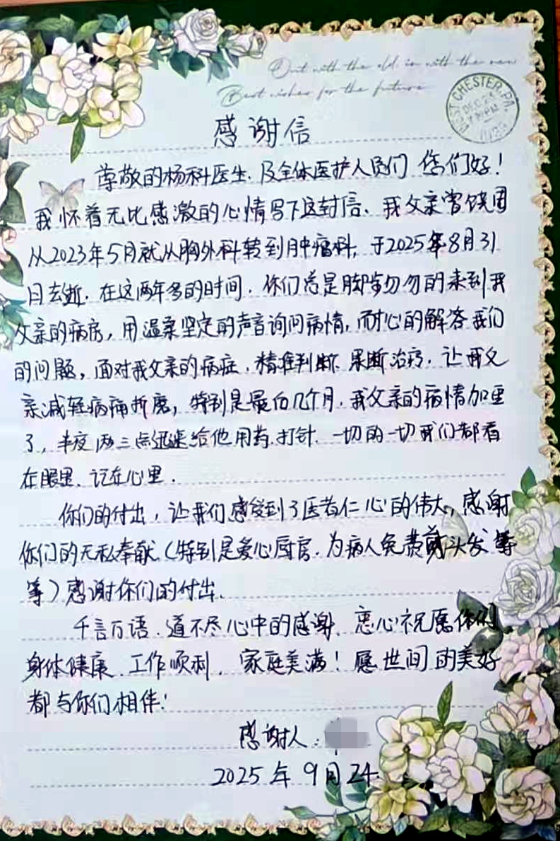 “父亲病重时,你们不辞辛劳,深夜紧急赶到病房对症治疗,减轻了他的痛苦。爱心厨房、免费理发……一桩桩小事温暖着我们。祝你们身体健康,愿世间美好与你们相伴。”9月23日,攀钢总医院肿瘤科杨科医生收到了一份珍贵的礼物——患者曾先生的家属送来的手写感谢信和锦旗。真挚的文字,再次唤醒了那段跨越生死的医患温情。