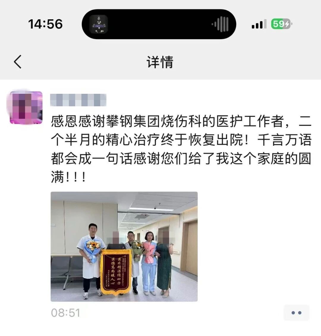 在长达70天的住院期间,护理团队为蒋先生量身定制康复计划,每日多次换药,严密监测感染指标,并持续给予心理疏导。9月24日,蒋先生终于康复出院。他的妻子在朋友圈深情写道:“感恩攀钢总医院烧伤科全体医护,是你们让我们的家庭重新圆满!”