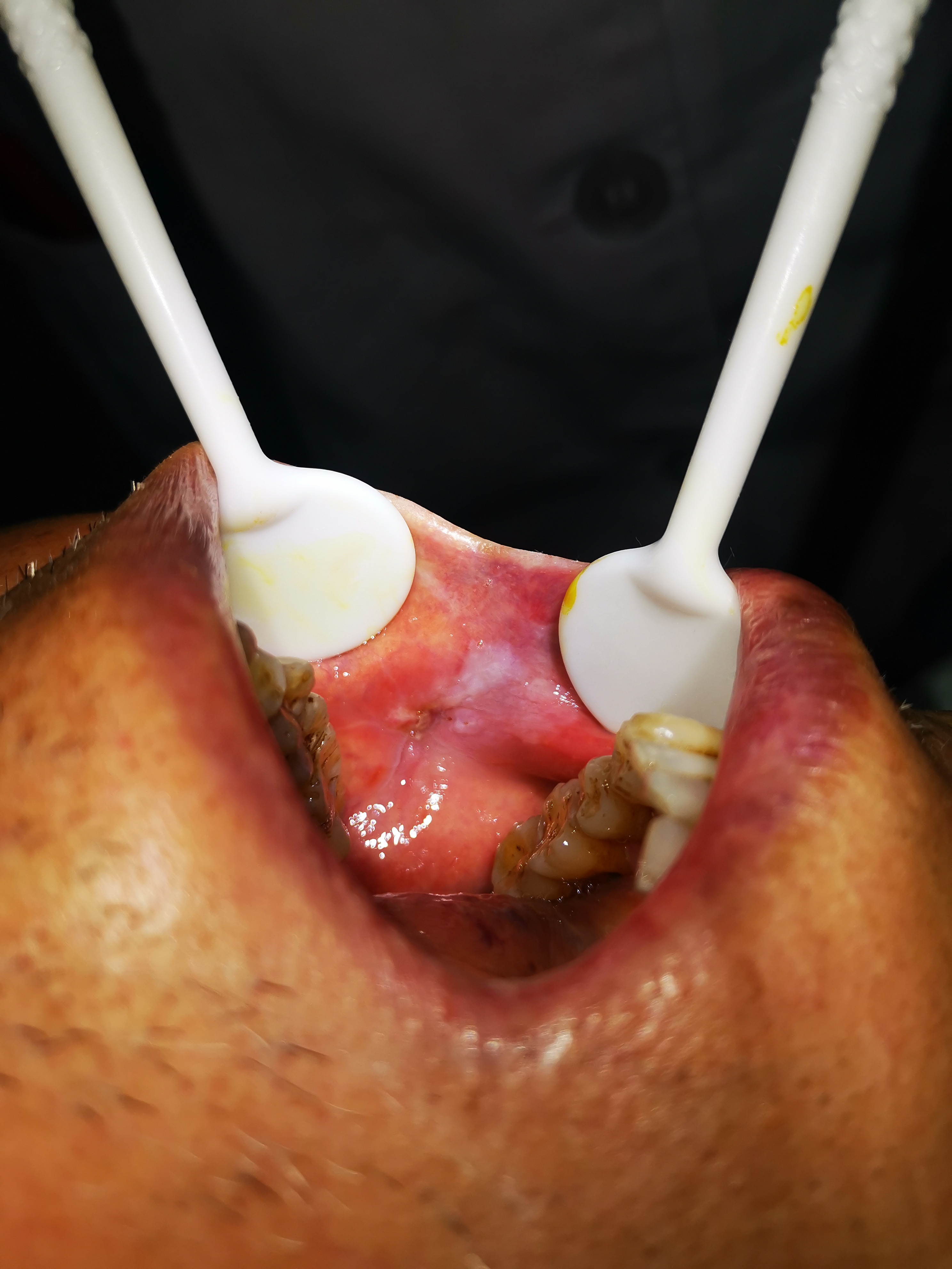 接诊医生详细问诊、细致检查后,综合评估病情,将其收入院手术治疗,给了绝望中的一家人莫大希望。面对手术高风险,医院立即启动多学科会诊(MDT),集结口腔科、麻醉科、心内科、呼吸科、ICU等多个科室专家,全面评估其心肺功能与麻醉耐受性,反复研讨手术方案,精心制定应急预案,最终确定为患者实施“肿瘤切除+右上臂刃厚皮瓣自体皮移植术”。