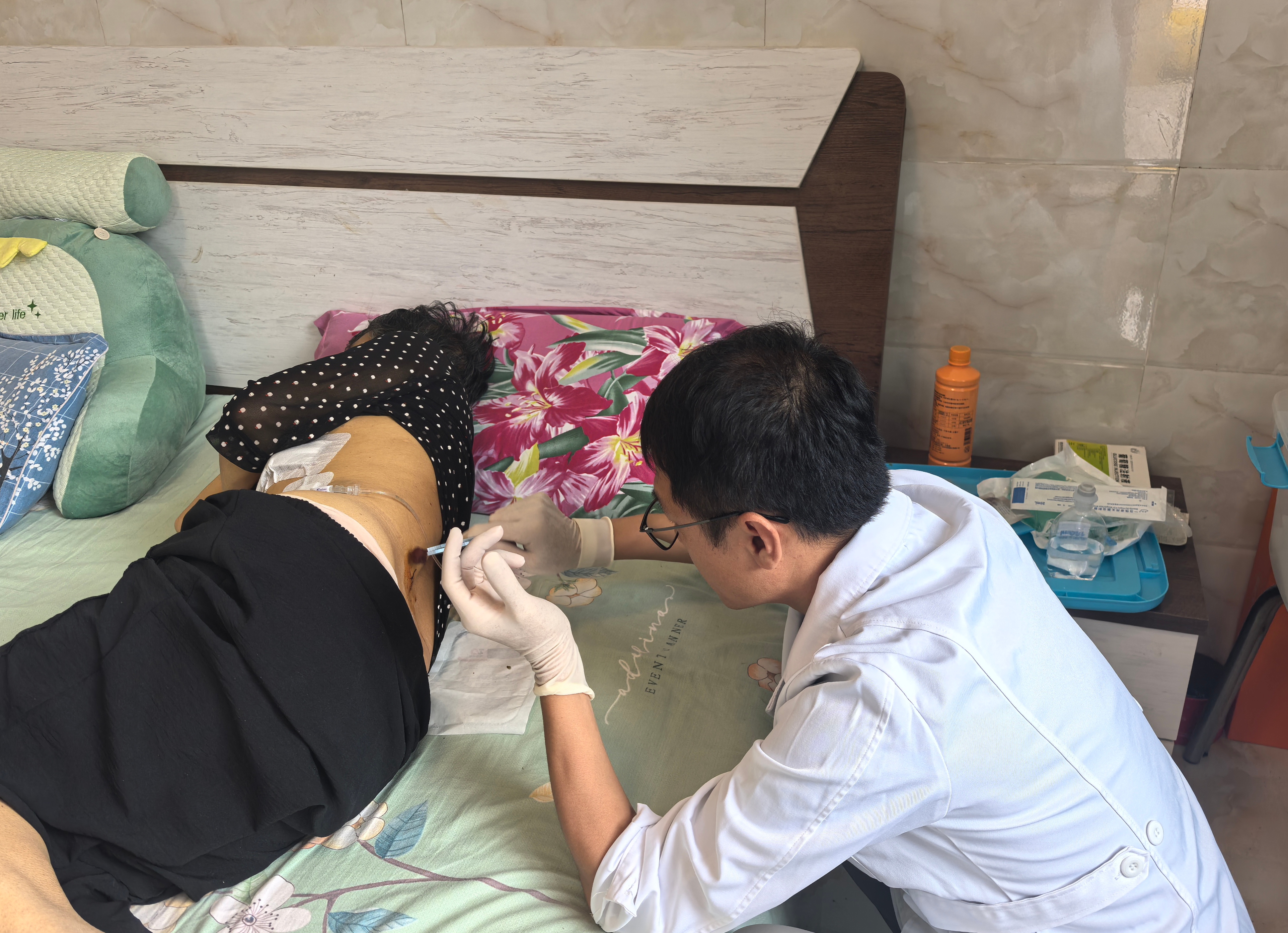 田主任叫上护士汪洪英带着换药的、调试泵的设备,自己开车上了山路。三个多小时盘山路,颠得人腰酸。到了晏阿姨家,田主任没急着动手,先蹲下来问了几句这几天吃饭、睡觉的情况,再看伤口、换药、调试鞘内泵——一套操作干得利索又仔细。汪洪英在旁边搭手,一边操作一边叮嘱家属注意事项。